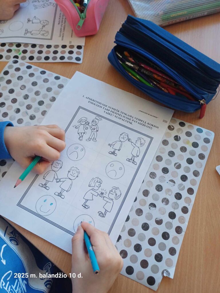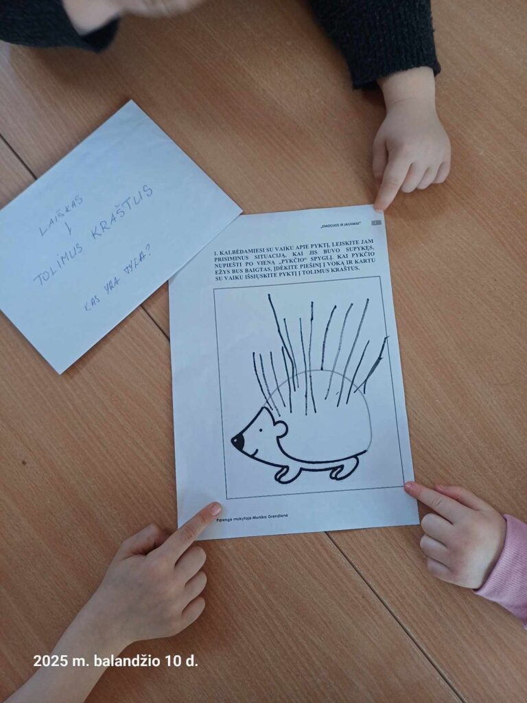 Ikimokykliniame amžiuje vaikams svarbu išmokti/mokintis reguliuoti ir kontroliuoti savo emocijas, bet jokiu būdu neslopinti ar užgniaužti. Vaikams svarbu suprasti, kad jausti visas emocijas yra normalu, tačiau jie turi išmokti jas reikšti neskaudinant kitų. Nėra „gerų“ ar „blogų emocijų“, užplūdus emocijoms, būna tik tinkamas arba netinkamas elgesys. Buvo piešiamos jų pačių tos dienos nuotaikos, baltame lape labai patiko pavaizduoti pyktį “makaliūzę”, o nusiraminimui nutapytas laimės piešinys. Išbandėme “pykčio kilimėlį”, nupiešėme ežį su pykčio spygliukais, kuris po to buvo išsiūstas į tolimus kraštus, mažieji mokėsi apkabinti draugus, draugauti. Su vaikais išsiaiškinome, kad žmonės jaučia visas emocijas ir labai svarbu pasikalbėti apie savo jausmus su tėveliais, draugais, mokytojais.