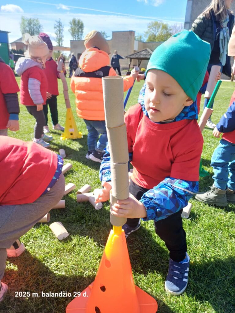Vaikų laukė ne tik fiziniai iššūkiai, bet ir kūrybinės užduotys – jie konstravo sporto inventorių iš antrinių žaliavų, lavindami vaizduotę ir komandinio darbo įgūdžius.