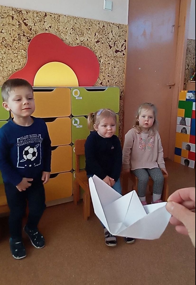 Po to, kai mažylius pavyko nustebinti iš popieriaus lapo išlanksčius laivelį, jiems buvo užduotas klausimas „ko reikia, kad laivas plauktų?“. Vienas vaikas pasakė – vandens, bet niekas neįvardino vėjo. Po to, kai pažaidėme laivo pūtimo vandenyje žaidimą, vaikams buvo pasiūlyta prikrauti laivą lego žmogiukų ir pažiūrėti, kas nutiks, jei jų prikrausime labai daug. Jei ugdytiniai būtų buvę didesni, jie galėtų skaičiuoti dedamus žmogiukus, įvertinti, daryti išvadas. Šiuo atveju, vaikai kol kas džiaugėsi žaidimu ir stebėjosi jo rezultatu – nuskendusiu laivu ir išskydusiu popieriniu laiveliu. Ugdytiniai gavo dvi pamokas: apie vandens poveikį tam tikroms medžiagoms, šiuo atveju popieriui ir apie svorį bei jo jėgą.