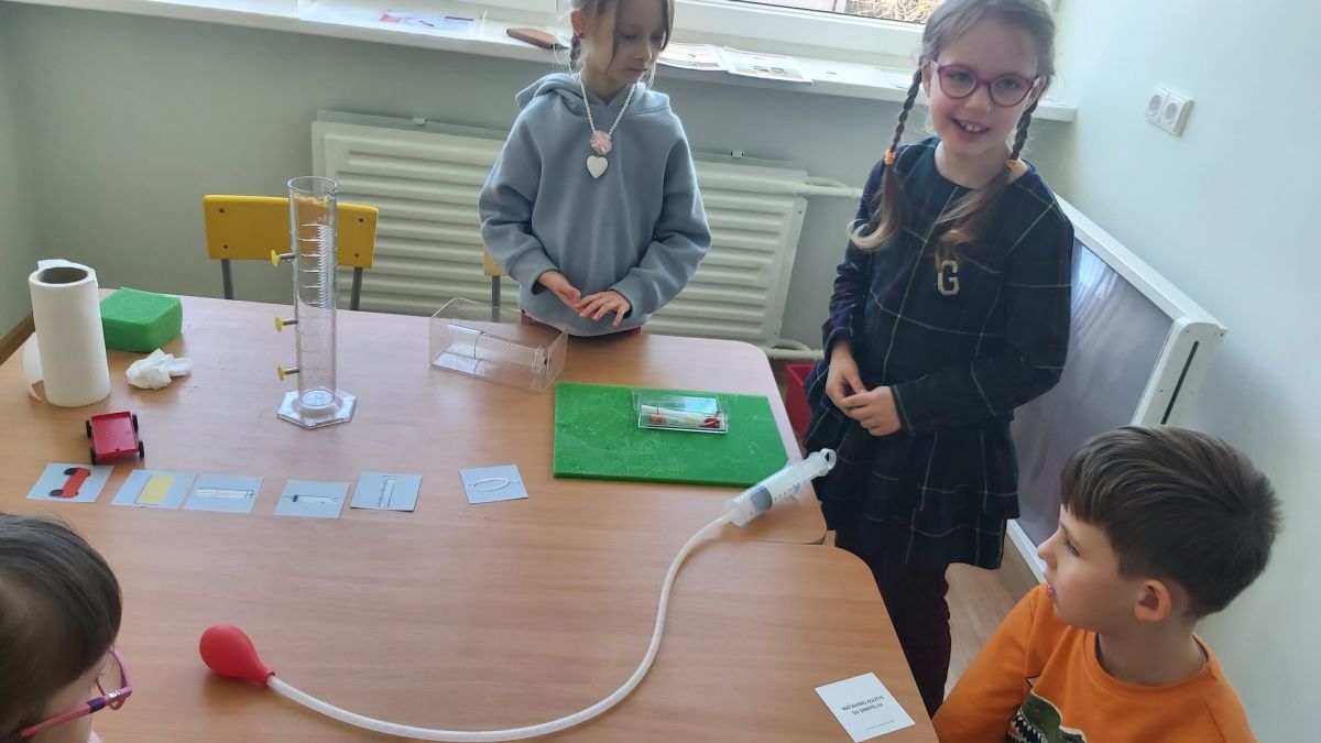 Oras yra kūnas, kuriam reikia vietos. Vaikai išbandė padaryti su balionu ir popieriaus lapu. Stūmokliu oras stumiamas žarnele į balioną, o balionas plėsdamasis kelia popieriaus lapą. Nieko nedarant oras iš baliono vėl grįžta į stūmoklį. Vaikai aiškinosi ir suprato, kodėl kartais netokėtai atsidaro durys.