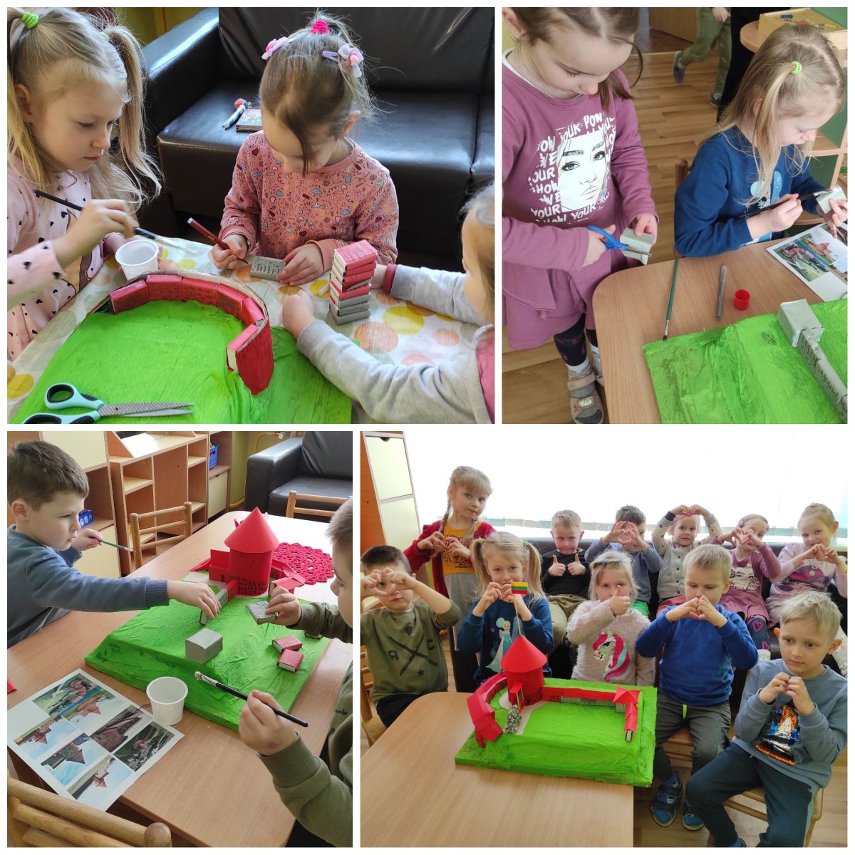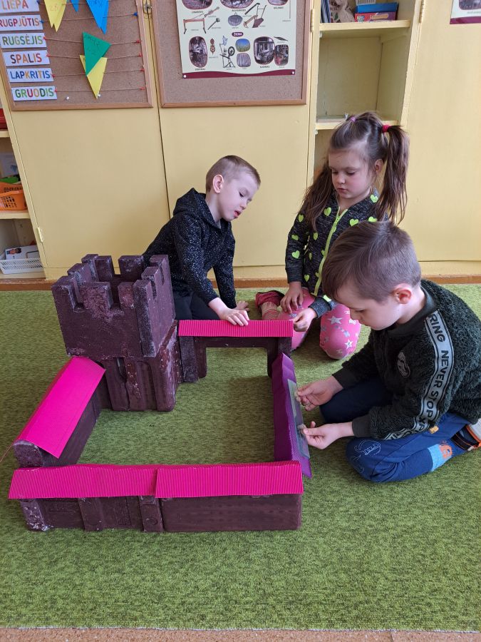 Mažieji konstruktoriai rinkosi įvairias medžiagas – Lego kaladėles, antrines žaliavas, gamtinę medžiagą, plastiliną. Statydami stebėjo vaizdus kompiuterio ekrane, nuotraukose, ieškojo pilies lokacijos Lietuvos žemėlapyje. Įvairiais matų vienetais matavo bokšto aukštį, plotį, aikštės perimetrą.