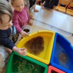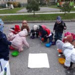 3 metų „Smalsučių“ gr. ugdytiniai tikrino kas vyksta, kai vanduo sušlapina įvairias medžiagas. Sušlapus žemei – ji netirpsta ir susidaro purvas, sušlapus cukrui – jis ištirpsta ir pasidaro cukraus tirpalas. Tokiu būdu vaikai susipažino su sąvokomis tirpus ir netirpus vandenyje. O kas nutinka, kai sušlampa spalvotas krepinis popierius? Tai jau smagioji dalis, suteikusi daug teigiamų emocijų ir fizinių galių išbandymo.
