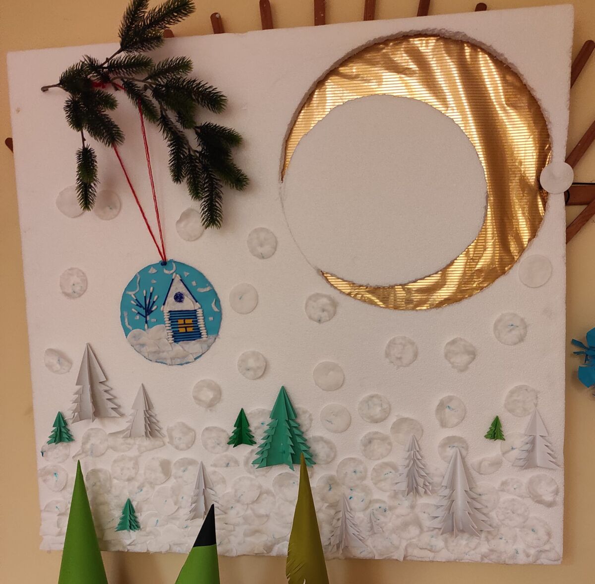 „Pagrandukai“ labai smalsūs ir darbštūs mažieji. Noriai priima pasiūlymą veikti, atnešti, padėti, bėgti, tyrinėti. Kūrybinės veiklos metu vaikai: liečia, klijuoja, bando dalyvauti, reaguoja į siūlymus, ima, uždeda, džiaugiasi, sukaupia dėmesį. Mes-tyrinėtojai! Vaikų kūrybinės veiklos indėlis metu svarus ir svarbus. Tyrinėjo vatos tampono sudėtį-jis dalinasi, lengvas, baltas, šiltas, lengvai klijuojamas. Susipažino su nauja medžiaga „putplasčiu“, jis lengvas, limpa, byra. Kam patiko draugystė, o kai kurie supyko, kad įkyriai laikosi prikibę. Mėnulio spalva- geltona, bandėm ištarti. Geltona spalva „kalba“, kai glamžome rankomis, garsas malonus, švelnus ir sako; lllm, mmmn, blmmm… Eglutes suskaičiavome: vienas, du. Išskyrėme ir parodėme: didelės ( kėlėme rankas į viršų) ir mažos (atsitupiame) eglutės. Žingsnis po žingsnio, visi kartu sukūrėme žiemos paveikslą ir juo kasdien džiaugiamės.