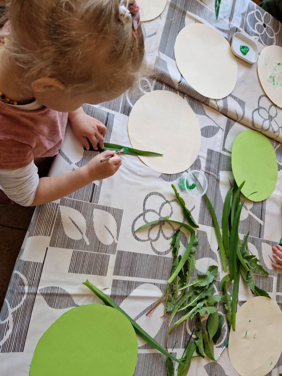 Veikla apėmė kelias dienas. Vaikai buvo supažindinti su tulpe ir narcizu. Lygino, ieškojo panašumų ir skirtumų. Pasiūlyta pamąstyti, kur daugiausiai gėlyčių galime rasti, buvo nuspręsta – pavasarinių gėlių paieškoti centro ugdymo kieme. Į pagalbą vaikai pasiėmė padidinimo stiklus ir pasiskirstę grupelėmis visi lauke ieškojo gėlių. Suradus gėlę bandėme prisiminti jos pavadinimą, pasakyti jos spalvą. Kitą dieną vaikams buvo pasiūlyta apžiūrėti į grupę atneštų įvairių lapų ir vaikai lygino, įvardino spalvas ir pasirinko jiems labiausiai patinkantį lapą. Lapą dažė lapo spalvą ir kokia tai spalva? Nudažytus lapus spaudė ant pasirinktos spalvos lapo ir su ausų krapštuku pripiešė žiedus. Ir veiklą užbaigėme lauke, ieškodami, kokios spalvos aplink mato daugiausiai ir vaikai atsakė: žalios ir geltonos. Geltonos gėlės? Tai mes išsiaiškinome, jog pienė ne gėlė, o piktžolė, ir pastebėjau, kad vaikai labai nustebo. Pasiskirstydami kūrė pavasario spalvų paveikslus.