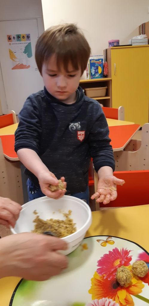 Išėję į lauką su vaikais pastebėjome, kad paukšteliai ankstesnius skanukus sulesė… Prieš pakabindami pirmuosius susitarėme, kad „baltojo bado“ laikotarpiu lesinsime nuolat, kad paukšteliams nepritrūktų lesalo. Kartu su vaikais gaminome skanukus. Buvo įdomu ką paukšteliai lesa. Pasirodo, sėklas, kurias vaikai mėgsta ir noriai ragavo, kruopas iš kurių verda košes, tik taukai vaikams nepažįstami, nors pauosčius teigė, kad kvepia skaniai. Viską maišėme, formavome, laukėme kol sušals ir nešėme į lauką.